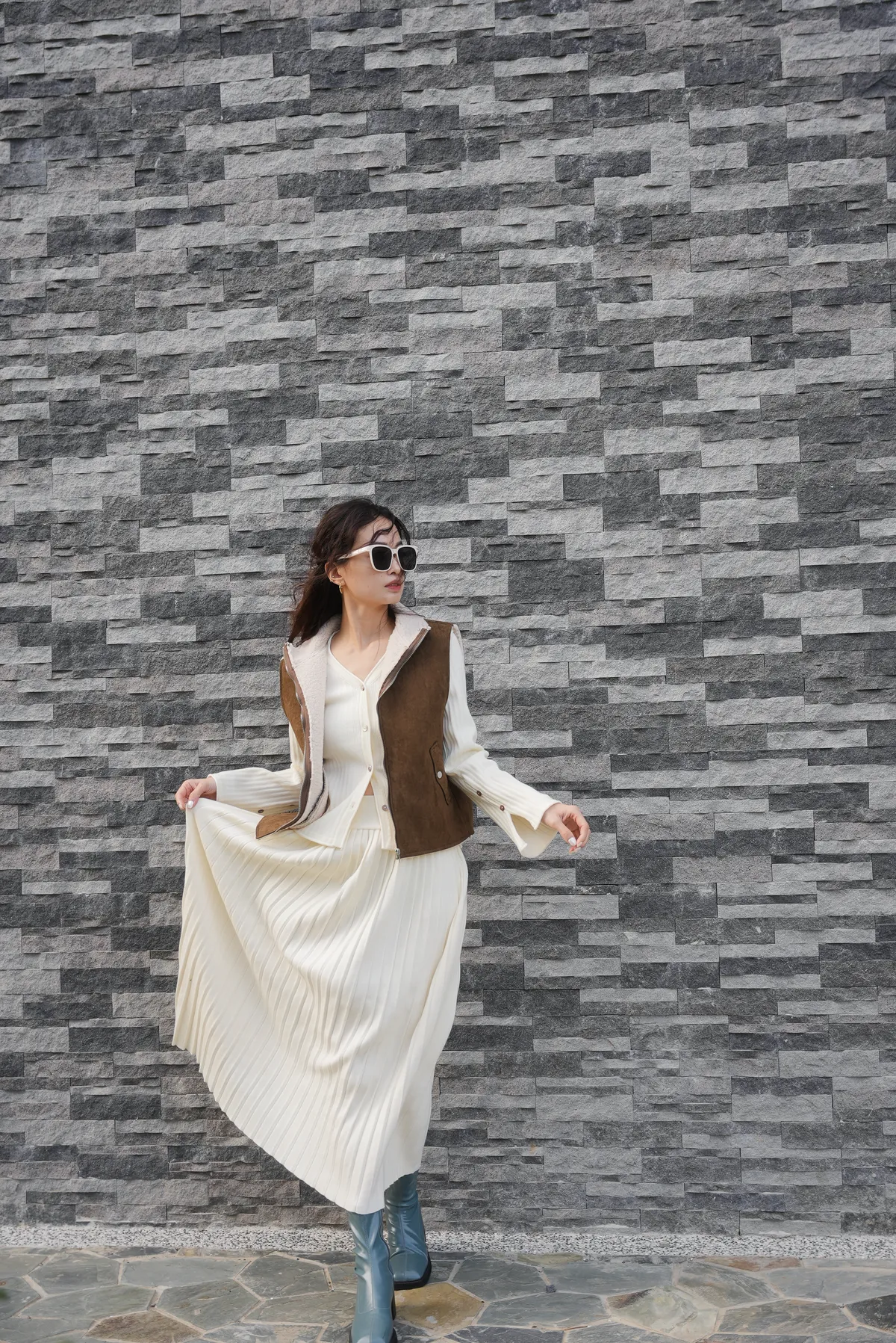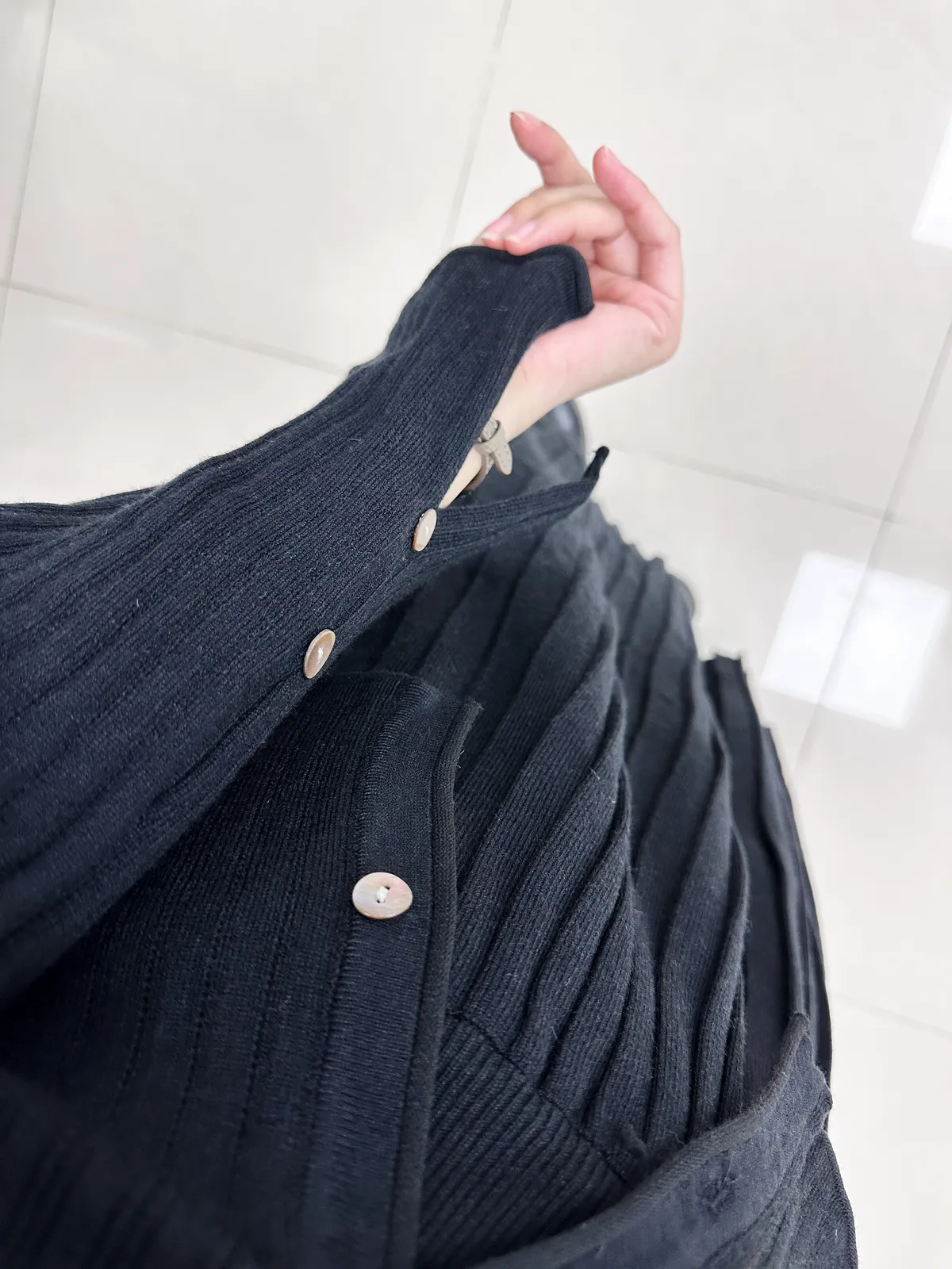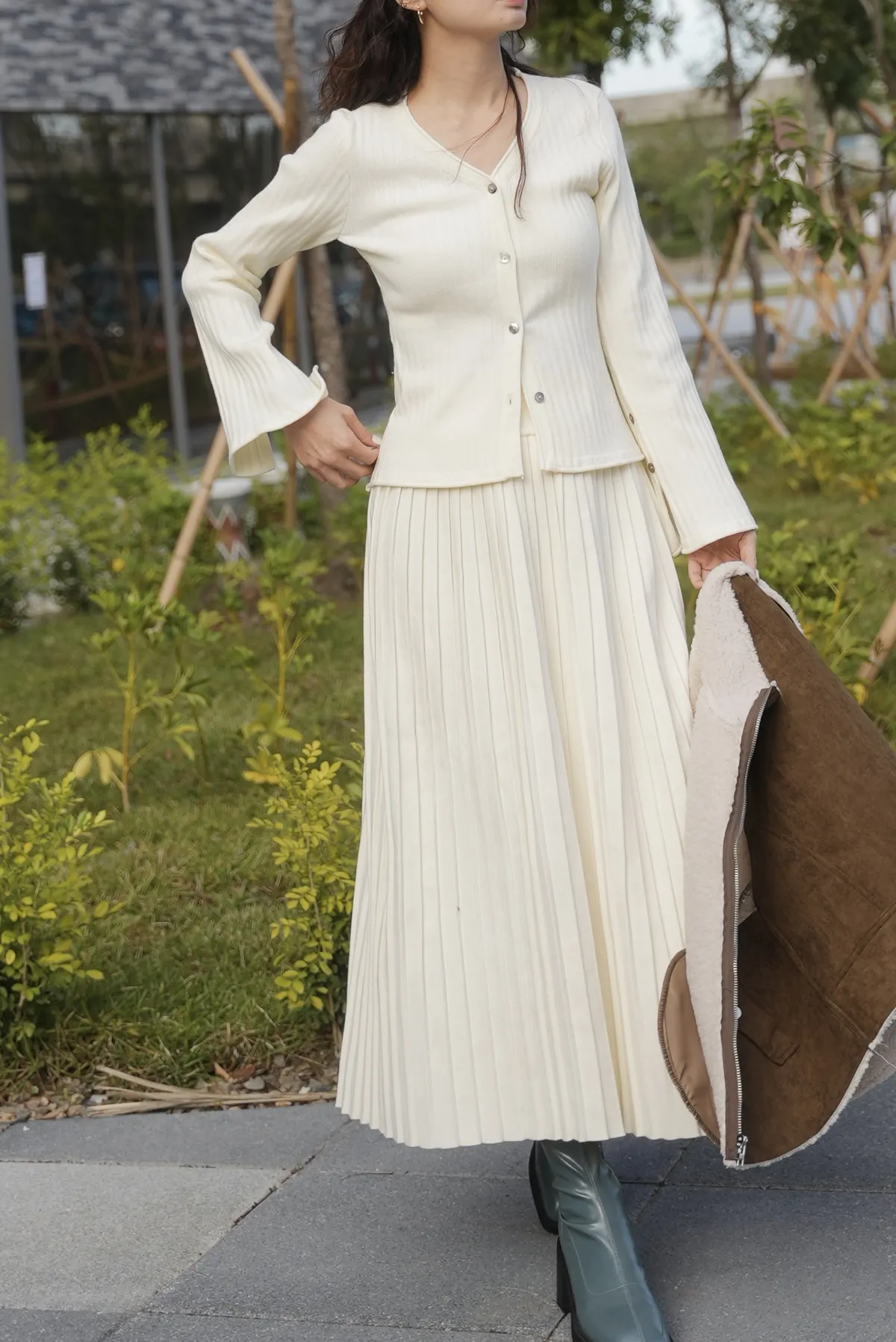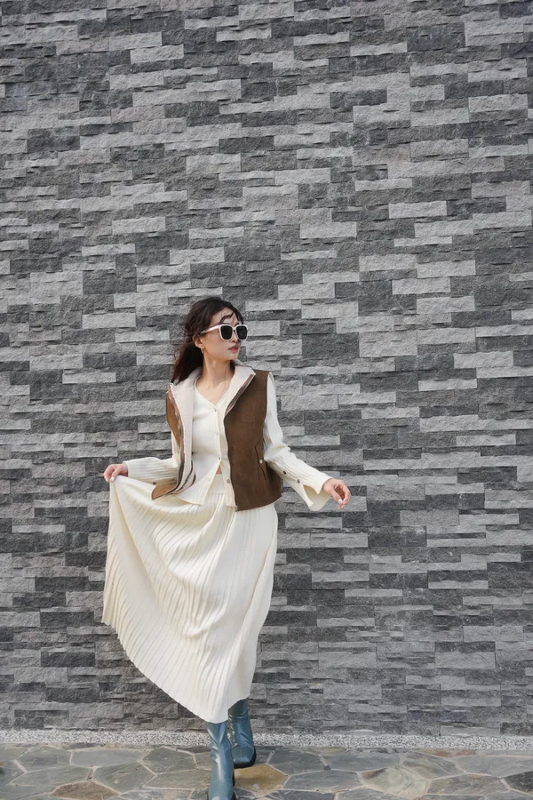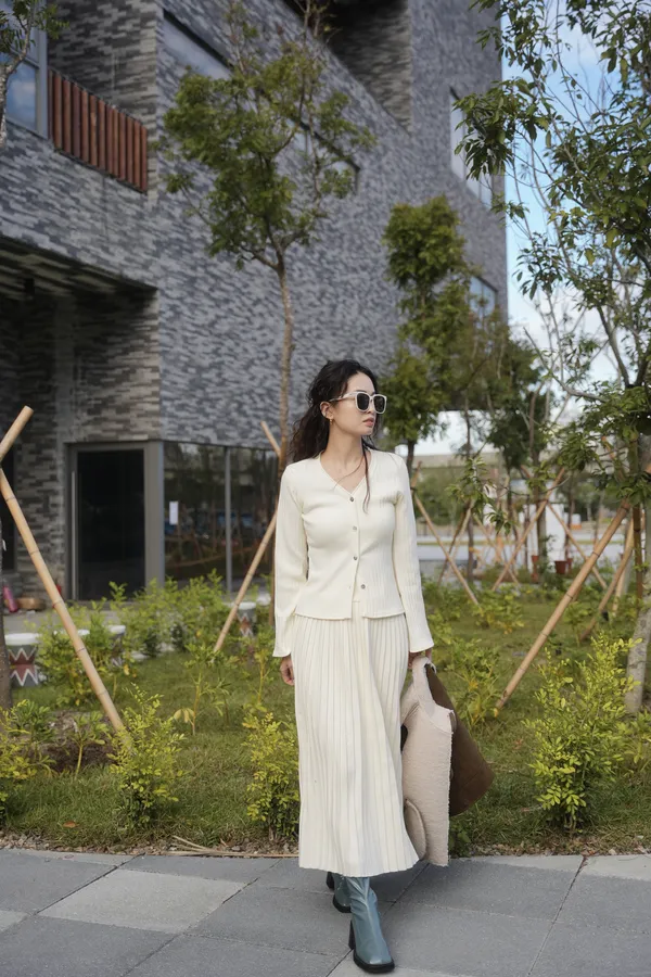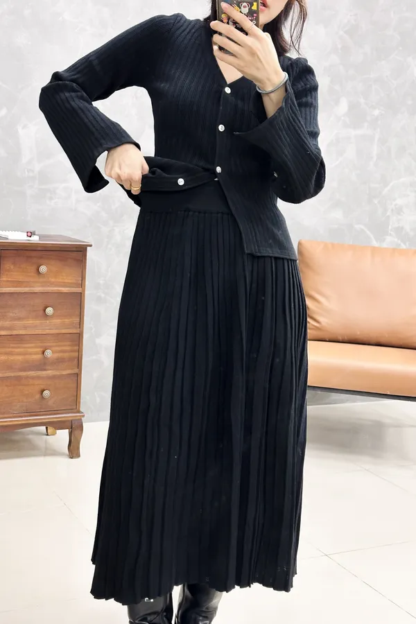 貝殼排釦上衣+縮腰針織百摺套裝裙