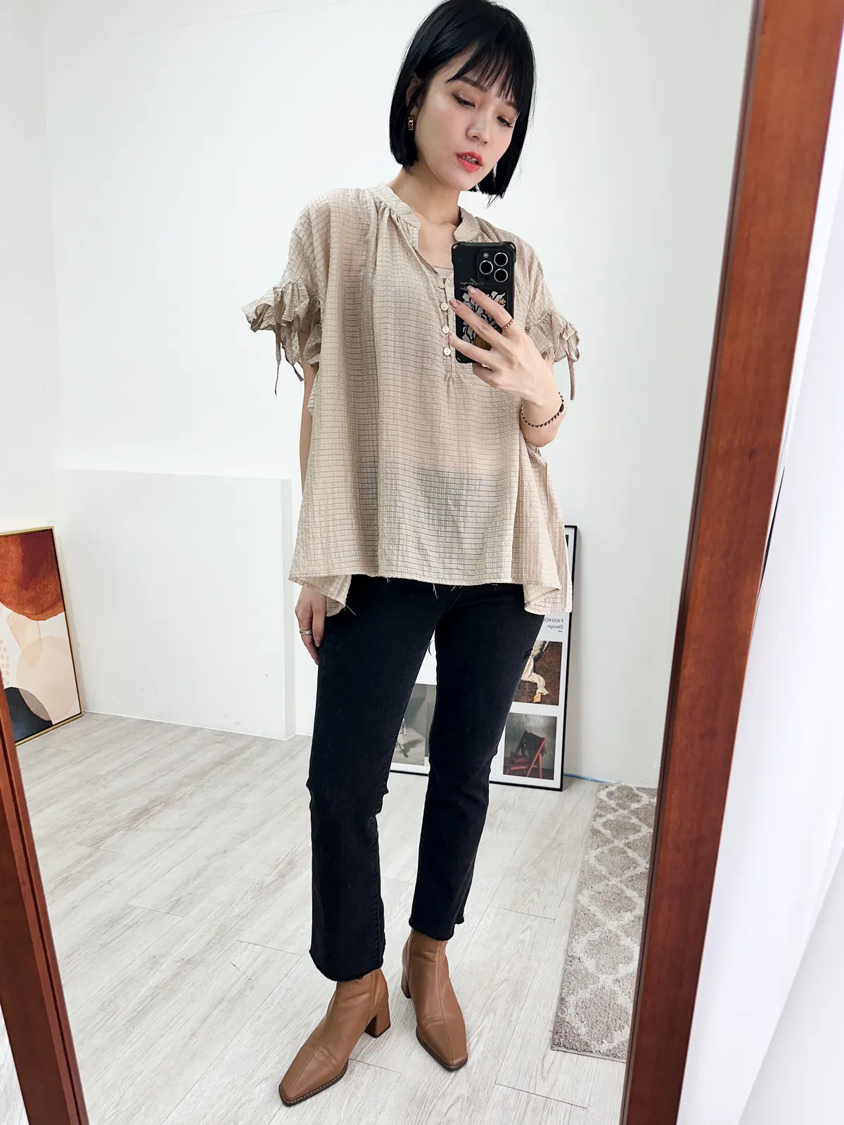 充滿心機跟細節的一款上衣布料的小格子紋理感看一眼會想再看第二眼材質很清透舒服袖子地方很特別有抽繩可調整平放不拉是五分袖抽起可以變短袖任何身型都適用喔 ⚠️ 注意事項請確認好尺寸、款式、顏色再下單若有疑慮都歡迎到粉絲專頁私訊我們我們會幫您建議適合的商品尺寸