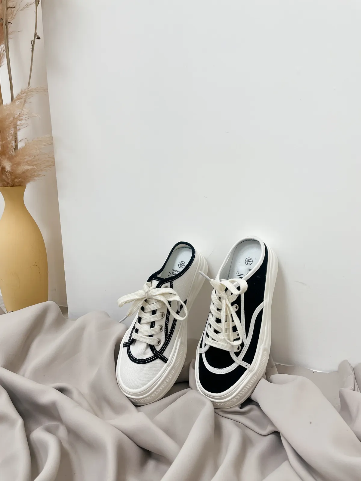 一見鐘情球鞋設計成穆勒鞋的樣子一套就走時髦不費力.這大牌感的跳色完全偷走我的心簡單的黑白撞色怎麼看都不會膩啊.底非常的軟比我自己的有牌球鞋還好穿 ⚠️ 注意事項請確認好尺寸、款式、顏色再下單若有疑慮都歡迎到粉絲專頁私訊我們我們會幫您建議適合的商品尺寸. 建議大半號喔闆娘這雙穿的尺碼▸38