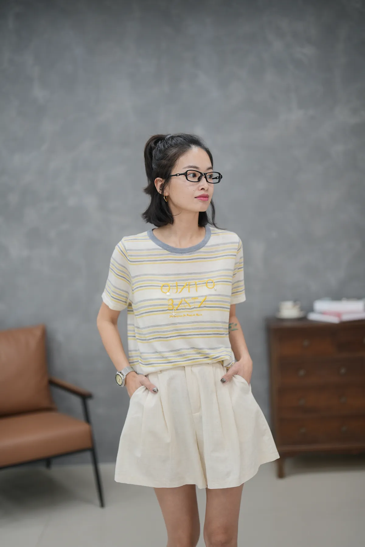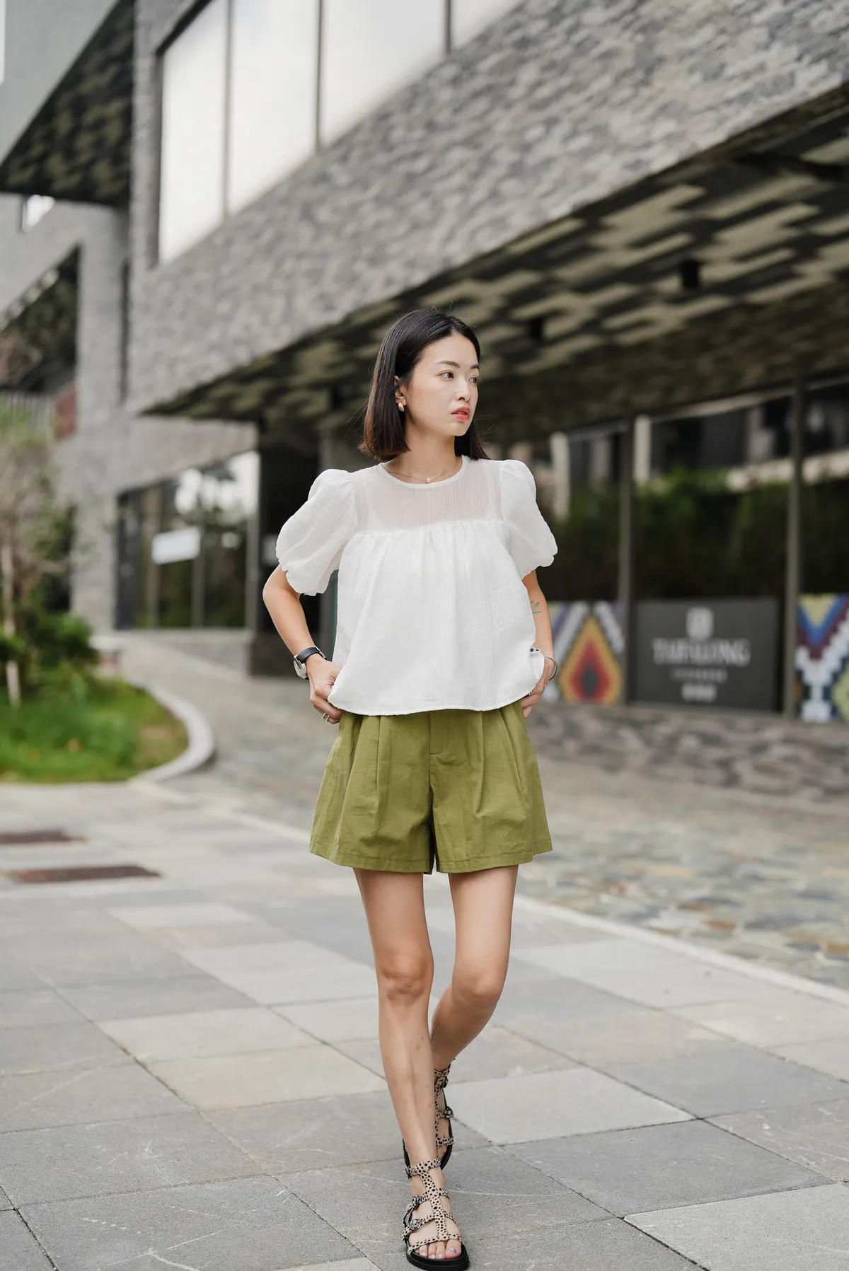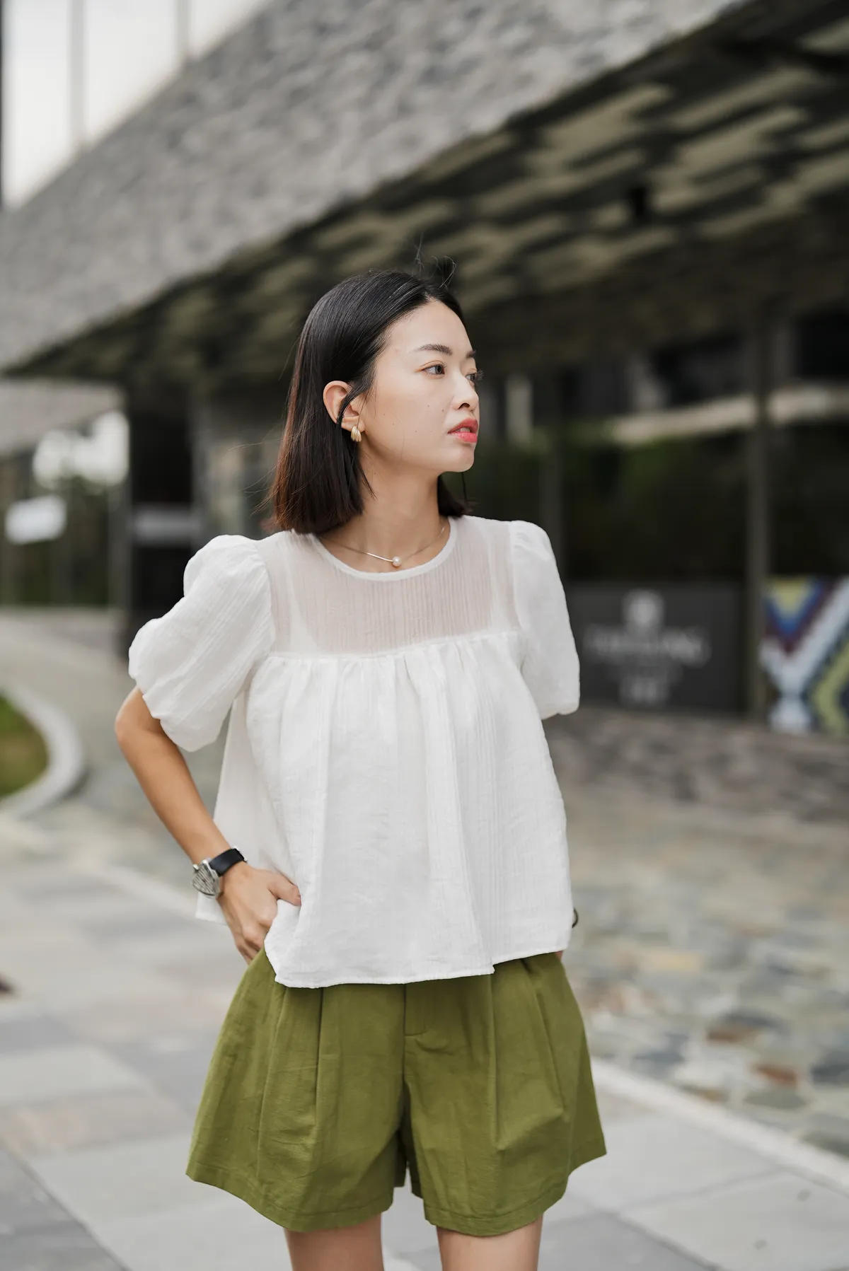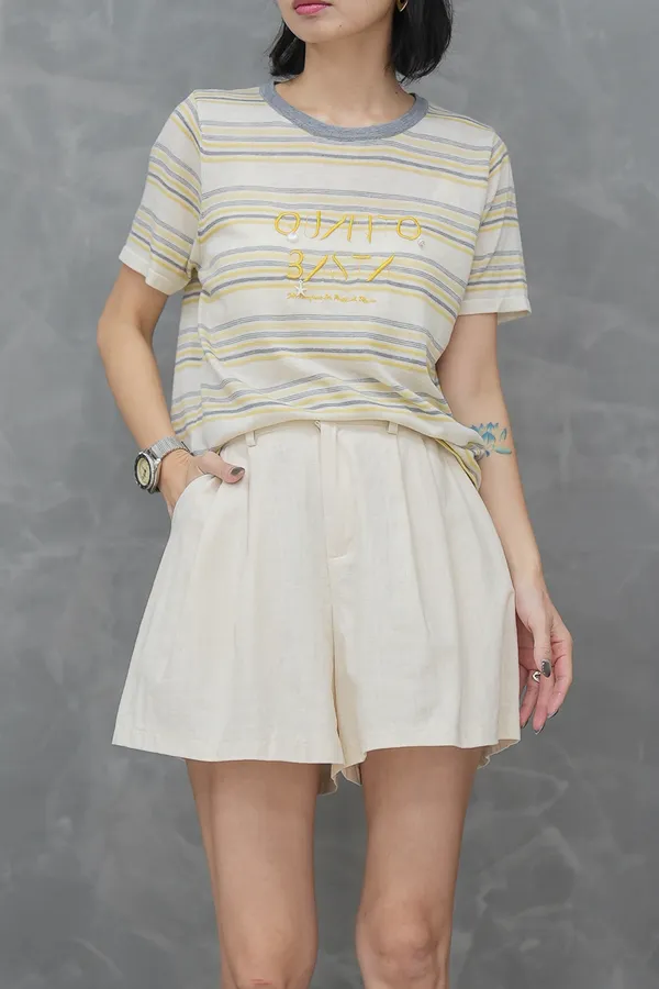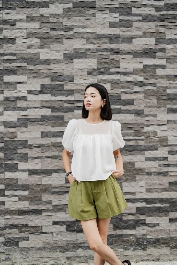 單釦後縮腰短褲(附綁帶)